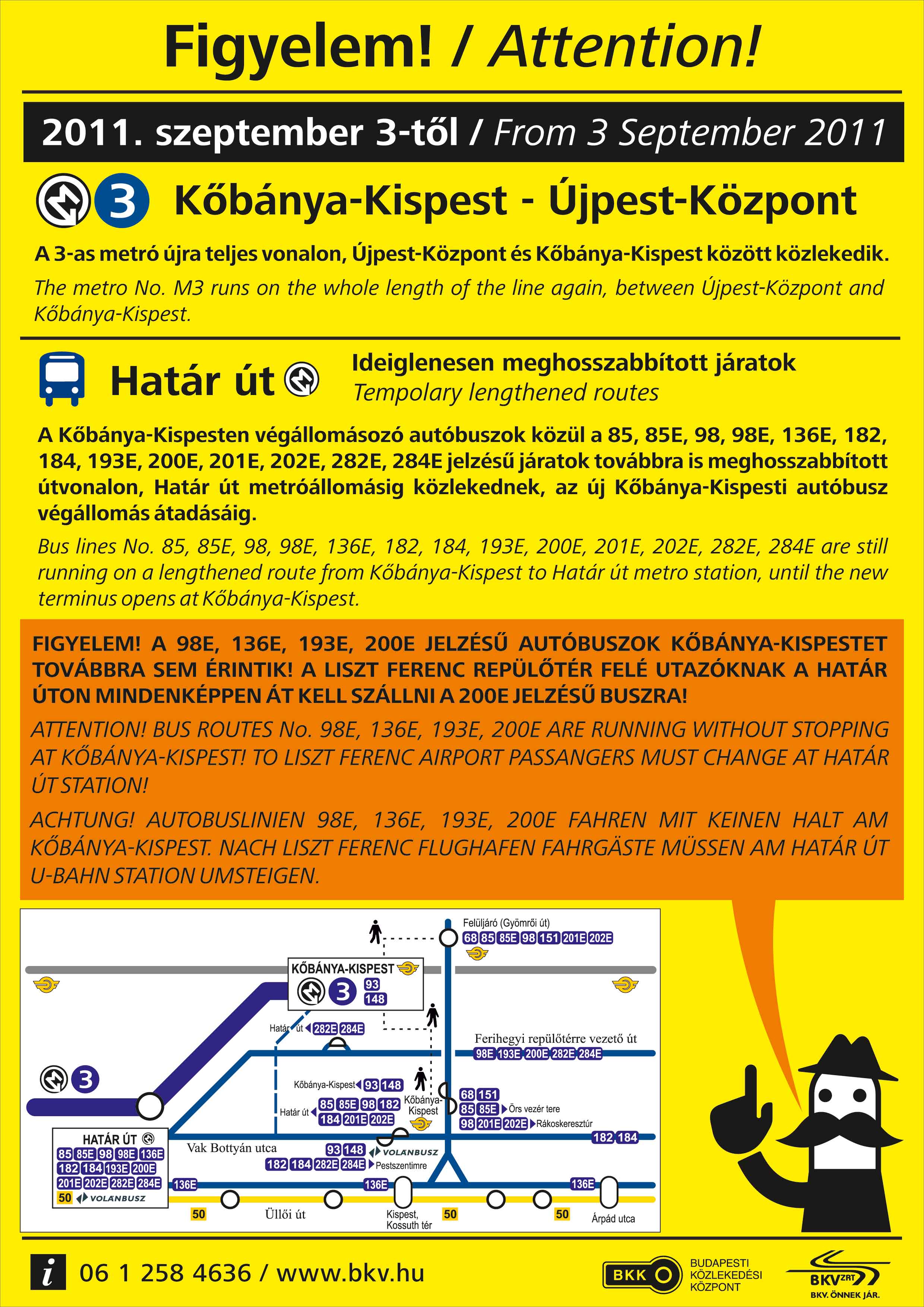 A fentiek szerint tehát szeptember 3-án, szombaton üzemkezdettől a 3-as metró újra a teljes vonalon, Kőbánya-Kispest végállomásig közlekedik. Az új Kőbánya-Kispest autóbusz-végállomás átadásáig azonban a 85, 85E, 98, 98E, 136E, 182, 184, 193E, 200E, 201E, 202E, 282E és a 284E jelű BKV autóbuszjáratok és a Volánbusz elővárosi járatok továbbra is meghosszabbított útvonalon, a Határ út metróállomáson kialakított ideiglenes végállomásig járnak.