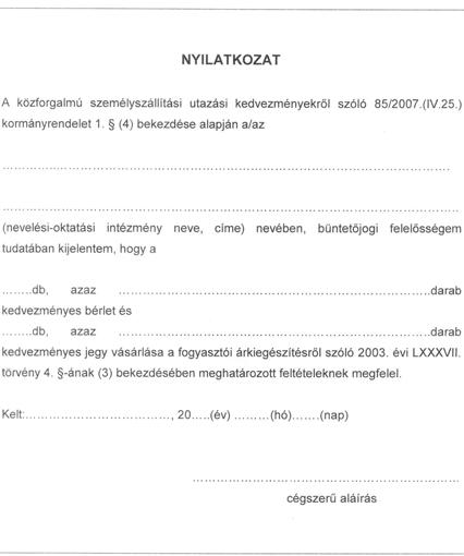 A Pénzügyminisztérium állásfoglalása alapján (10.620/2/2007) a mellékelt nyilatkozatot kell a nevelési és oktatási intézményeknek és gyermekotthonoknak benyújtaniuk, ha egyszerűsített számlát kívánnak kapni kedvezményes jegy vagy bérletvásárlásakor.