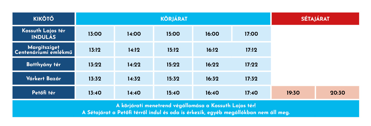 - A Sétajárat a Petőfi térről indul oda is érkezik, egyéb megállókban nem áll meg.