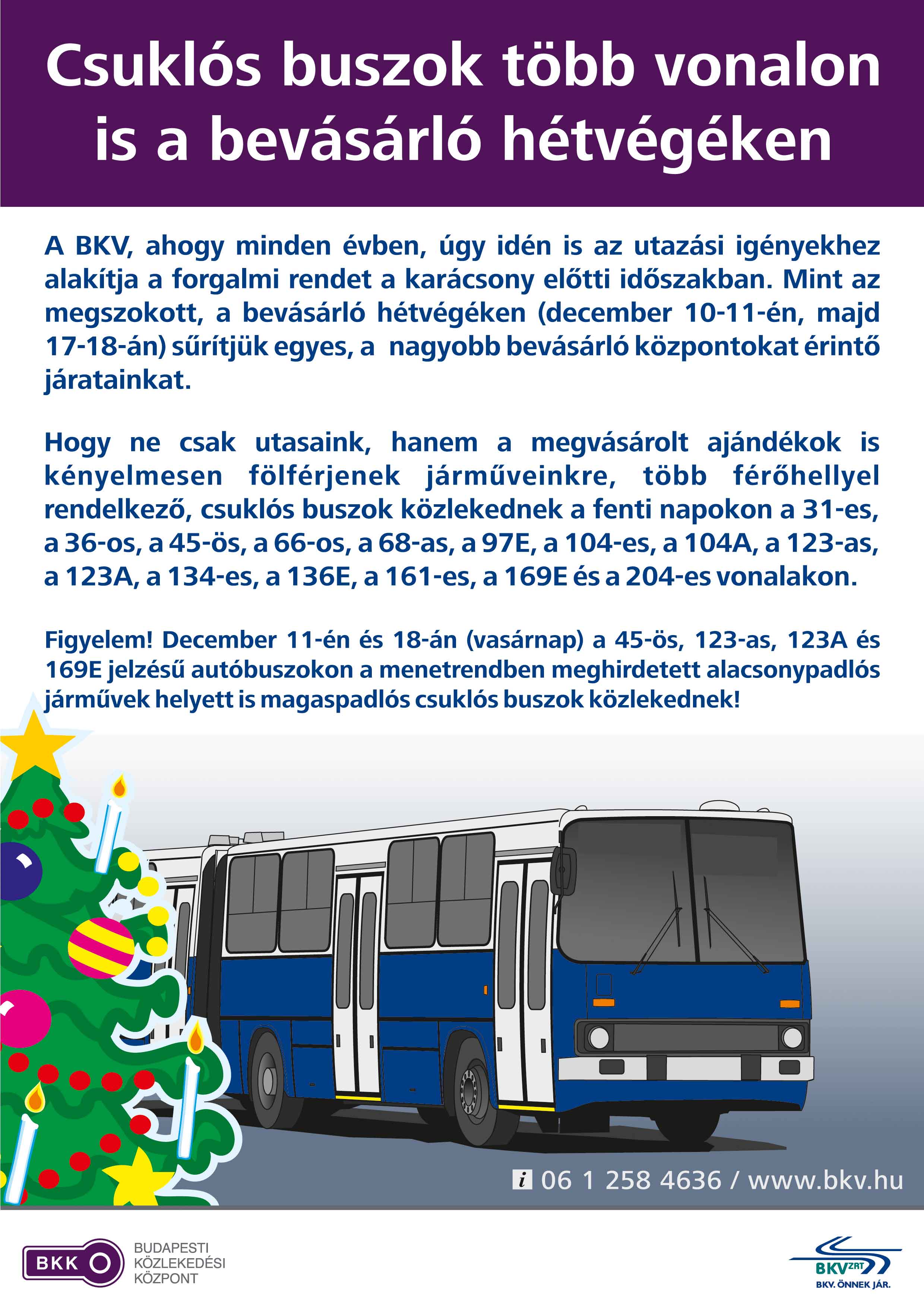 A december 24-ét megelőző Ezüst- és Aranyvasárnapi hétvégéken (december 10-11-én, majd 17-18-án) nagyobb utasforgalomra számítunk a bevásárló központok környékén, ezért sűrűbben közlekedtetjük a 4-es, 6-os, 18-as, 47-es, 49-es, valamint az 50-es villamosokat, a 80-as trolibuszt, az 58-as és a 85-ös autóbuszokat. Ezeknek a járatoknak a menetrendjei megtalálhatóak a BKV Zrt. honlapján (www.bkv.hu), és a megállókba kihelyezett utastájékoztató hirdetményeken.