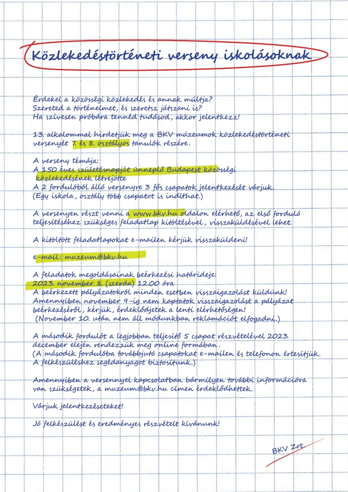 A BKV idén is meghirdeti múzeumainak évtizedes hagyományra visszatekintő közlekedéstörténeti vetélkedőjét 7. és 8. osztályos tanulók részére. A téma ezúttal a 150 éves születésnapját ünneplő főváros közösségi közlekedésének létrejötte lesz. A verseny első fordulójának feladatlapja a BKV weboldalán érhető el, és november 8-ig kell kitölteni.