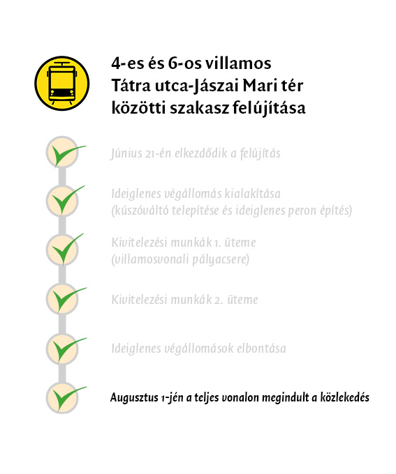 Június 22-én, vasárnap 4:00-tól várhatóan július 31-ig a 4-es és a 6-os villamosok a Jászai Mari tér (Vígszínház) ideiglenes végállomás és a dél-budai végállomások Újbuda-központ M, illetve a Móricz Zsigmond körtér M között közlekednek. A 4-6-os pótlóbusz a Nyugati pályaudvar M és a Széll Kálmán tér M között közlekedik, de a villamosokról a Jászai Mari tér (Vígszínház) ideiglenes végállomáson érdemes átszállni a buszokra.