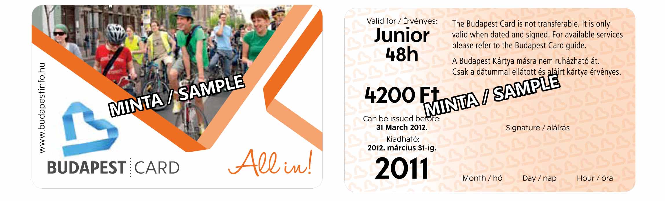 A Budapest Kártya Junior egy 10-18 éves utas és egy vele lévő, legfeljebb 14 éves gyermek számára érvényes. A kártya személyre szól, át nem ruházható. Érvényes a feltüntetett kezdő időpontot (hónap, nap, óra, perc) követő 48 órán át, ezalatt ingyenes és korlátlan utazást biztosít a BKV Zrt. járatain, villamoson, trolibuszon, földalattin, metrón, fogaskerekűn a vonalak teljes hosszán, HÉV-en Budapest közigazgatási határáig, autóbuszon a Budapest közigazgatási határán kívüli első megállóig. Nem érvényes a Siklón és a Libegőn.